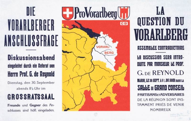 Schon bald gab es in Vorarlberg erste, in Thema Vorarlberg von Peter Melichar jüngst thematisierte Bemühungen für einen Anschluss an die Schweiz, die auch dort Diskussionen auslösten. In seinem letzten Bericht an das k.u.k. Ministerium des Äußeren berichtete Legationsrat Leo Freiherr de Vaux am 30. November 1918, dass sich die Schweiz „allen Ernstes, ihren Anteil aus der allgemeinen Liquidation Mitteleuropas herausnehmen zu wollen“ anschicke. Die Vorarlberger würden dabei gar als eine „Art Urschweizer“ bezeichnet.