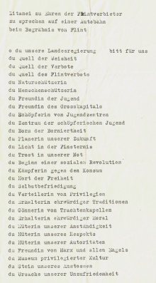 Die frustrierten Organisatoren wollten die Absage nicht widerstandslos hinnehmen und zelebrierten das Ende von Flint in Form einer Beerdigung. Diese fand in der Nähe der Neuburg auf der Schottertrasse der sich damals gerade in Bau befindlichen Rheintalautobahn statt. 500 Jugendliche hatten sich eingefunden, um Flint symbolisch mit Sarg, Kreuz und drei Kränzen zu Grabe zu tragen. Dabei wurde eine Litanei – eigentlich war es ein Spottgedicht auf die Geisteshaltung der Vorarlberger Landesregierung – verlesen, bei der nach jeder Verkündigung des Ansagers ein kollektives „Bitt für uns“ folgte.