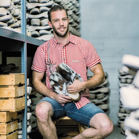 Kommt man in die Nähe der Devich Holzschuherzeugung in Bezau, dringt aus der Werkstatt schon ein Hämmern und Klopfen. Das Betreten des urigen Bregenzerwälder Bauernhauses ist nach einem kurzen Klingeln gestattet. Und so tritt man ein, in eine fast vergessene Welt – der Geruch von Leder beherrscht den Verkaufsraum, und man ist mitten drin im Herzstück einer der letzten Holzschuhmanufakturen Österreichs. In Regalen, die bis an die Decke reichen, kann man die handgemachten Devich-Schuhe bewundern: Hölzler – ganz klassisch aus Holz und glattem Leder, etwas ausgefallener mit Fell oder richtig flippig in knalligen Farben – ziehen die Aufmerksamkeit augenblicklich auf sich. Aber auch kniehohe Fellstiefel, Clogs, Damenschuhe mit Holzabsatz und sommerliche Sandalen gehören zum Repertoire der Schuhproduzenten. Geführt wird der Betrieb vom 24-jährigen Daniel Devich in vierter Generation. Alleine ist er trotzdem nicht: „Zusammen mit meinem Vater und meiner Schwester führen wir das Unternehmen in einer Art Triumvirat“, berichtet er vom wertvollen Austausch der Generationen und der konstruktiven Zusammenarbeit im traditionsreichen Familienbetrieb.