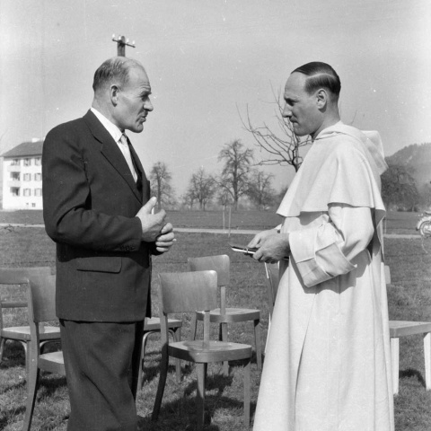 Es ist faszinierend, wie die Digitalisierung und nachfolgende Veröffentlichung im Internet Fotosammlungen zu neuem Wert verhelfen, da sich so früher kaum auffindbare Quellen zu einem Thema öffnen. Im Nachlass des Bregenzer Pressefotografen Oskar Spang, der im Moment in Kooperation des Stadtarchivs Bregenz und der Vorarlberger Landesbibliothek bearbeitet wird, finden sich Fotos vom Europadorf in Hörbranz, wo ein Treffen des damaligen Vorarlberger Landeshauptmanns Ulrich Ilg mit dem späteren Friedensnobelpreisträger Dominique Pire stattfand. Spang war als freier Pressefotograf immer auf der Suche nach Motiven, die bei regionalen und internationalen Zeitungen Abnehmer finden konnten. Offensichtlich übte das Projekt in Hörbranz aber eine so große Anziehungskraft aus, dass auch der Freiburger Pressefotograf Willy Pragher nach Hörbranz reiste, um das Europadorf zu dokumentieren. Der Nachlass von Pragher (1908-1992) umfasst mehr als eine Million Fotos, darunter Glasplatten, Negative, Dias und befindet sich im Staatsarchiv Freiburg (Abteilung des Landesarchivs Baden-Württemberg), wo Teile des Bestandes digitalisiert wurden. Viele Institutionen bieten ihr Fotomaterial sehr benutzerfreundlich an und oft ist nur die Namensnennung des Besitzers notwendig, um ein Bild für eine Publikation zu verwenden.