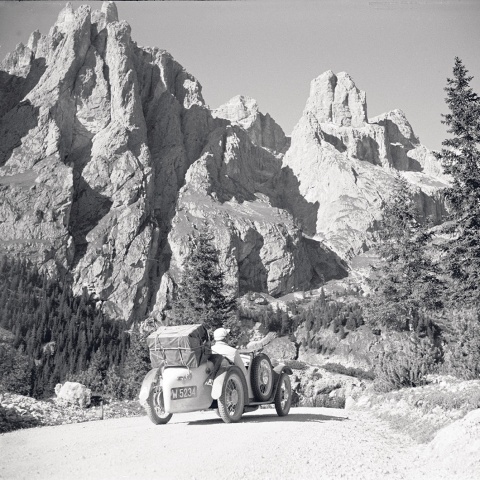 Es ist ein sonniger Tag in den Dolomiten. Ein kleines Cabriolet schraubt sich die unbefestigte Gebirgsstraße hinauf. Vom stromlinienförmigen Flitzer sehen wir nur das Heck und eine verkürzte Seite in verlorenem Profil. Den Hintergrund dominieren zerklüftete Felsen in modellierendem Streiflicht. Der Beifahrer trägt eine helle Jacke und eine dazu passende Schildmütze. Er blickt in Fahrtrichtung, was den Eindruck vermittelt, es handle sich um ein Filmstill. Würde man „play“ drücken, wäre der BMW Wartburg bereits um die nächste Kurve verschwunden. Wohin? Jedenfalls lässt der in Segeltuch verschnürte und auf einer Gepäckbrücke montierte Koffer an eine längere Reise denken. Auf den zweiten Blick treten dann die kleinen „Regiefehler“ zutage: Ein fahrendes Auto wäre aufgrund des aufwirbelnden Staubes der unbefestigten Straße unsichtbar und ohne Chauffeur fahruntüchtig. Wer außer dem Wagenlenker hätte den Auslöser betätigen können? Bei der Inszenierung wurde das Augenmerk weniger auf Authentizität als vielmehr auf größtmögliche Wirkung gesetzt.